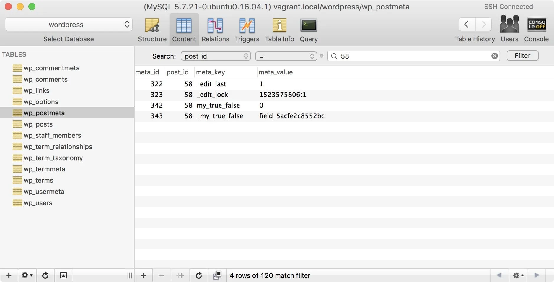 Note the two records entered by ACF for the one field: one record being the value, the other being the field key reference. You might not consider this to be a problem at this scale, but imagine having 1000 posts, each containing 5 true/false toggles. That’s 10,000 records in your post meta table, just for the one field!